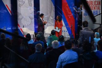 Republican presidential candidate Vivek Ramaswamy participates in a CNN Republican Town Hall moderated by CNN’s Abby Phillip at Grand View…