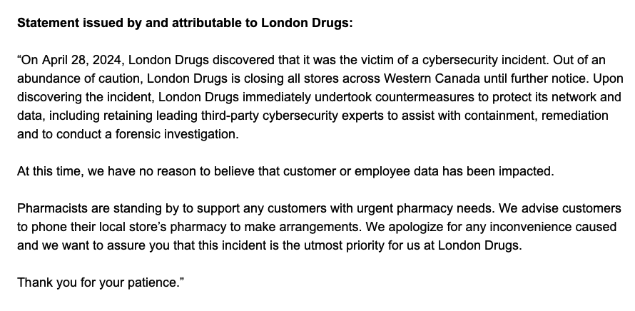 “On April 28, 2024, London Drugs discovered that it was the victim of a cybersecurity incident. Out of an abundance of caution, London Drugs is closing all stores across Western Canada until further notice. Upon discovering the incident, London Drugs immediately undertook countermeasures to protect its network and data, including retaining leading third-party cybersecurity experts to assist with containment, remediation and to conduct a forensic investigation.